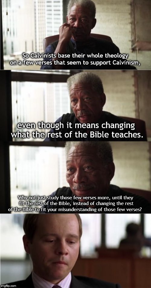 Calvinism, in order to make square pegs fit into round holes, is obligated to change the clear and contextual meaning of the very simplest of words and give them another meaning altogether. Its adherents often use the same vocabulary as Free-Will Provisionists, but with a very different dictionary. If the foremost rule in proper Bible hermeneutics is to interpret words in the most literal sense according to context, then the context of the above verses can only mean “all really does mean all, and, any really does mean any.” To say, as the theistic determinist does when attempting to rescue his theology from the clear abrogation these passages bring, that they are only referring to “all kinds of men” or “any of the elect” is to do violence to the clear, contextual meaning of the words and applies a hermeneutic that would make even a Jehovah’s Witness blush. If one must write long arguments and even entire books to explain why a verse doesn’t really mean what it appears to be saying at face value, then there must be a problem with that conclusion. There is absolutely nothing in the passage to indicate that the Holy Spirit, though the pen of the apostle, was only referring to all kinds of men. The context demands that the word be understood in its clearest and simplest form. If God meant to say all kinds of men, he would have inspired the apostle to include the word “kinds.” But in order to twist the context and save their doctrine from the clear contradiction that these verses bring, determinists must insert the word where it is not merited. This is dishonest and is not sound hermeneutics or exegesis. In reality, no twists and turns or hermeneutical gymnastics are required. In this context, all means all. Any means any. Amen, end of story, full stop. Let’s go home. Ah, but there’s more…much, much, more.