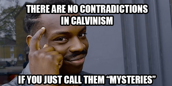 *In Calvinism, circles are squares, parallel lines connect, and bachelors are married. Two plus to can indeed be five, or seventeen. To explain their theological and logical contradictions, the Calvinist is forced into a corner where he can only use long words, change the subject, or say something like “it is a mystery” or that God “has a hidden will and a revealed will.” Sometimes they use the example of a novel, where the author decides and decrees all that will happen, but within the pages the characters do not realize this and actually believe that they are making their own decisions. This analogy is a bad one because it makes God a master deceiver and is not inferred anywhere in the Bible. Such explanations do not answer the question at hand and only cause further confusion.